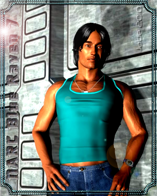 I added the Midnight Prince hair, set to ebony. Now, Joe is supposed to wear his hair in a braid, and if I turned him around right now, you'd see he's wearing it in a ponytail. And it's going to stay that way till I buy a hairdo that fits the character! Midnight Prince is a fantastic hairstyle, so versatile. Then, the jeans from the Stylin' set; the tank from the M4 Basic Wear, and the boots, dogtags and watch from the M4 Aircrew. Mess about with the colors of all ... add a background from the SF Construction Set, three distant lights with shadows set to Deep Shadow Map... pose the model and render away!