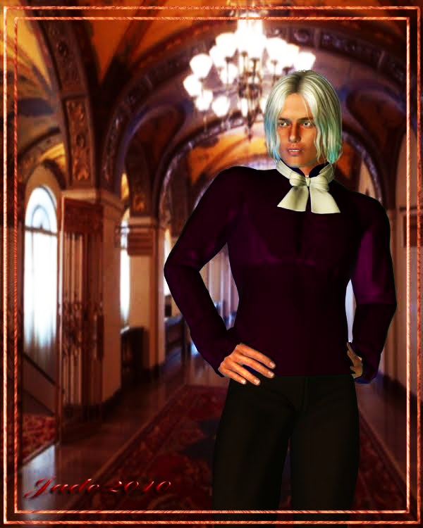 This is trusty, reliable Michael 4, wearing Midnight Prince hair set to white, and the Jagger skin map -- but not the Jagger face. This face is designed by me. He's wearing the shirt, britches, boots and necktie (stock?) from the M4 Regency set, with colors and textures assigned by me. I don't doubt that no other Regency beau from Dublin to Rome was wearing black, head to foot, with a blood-scarlet necktie, but ... Amadeus is a vampire. He's allowed to be different!