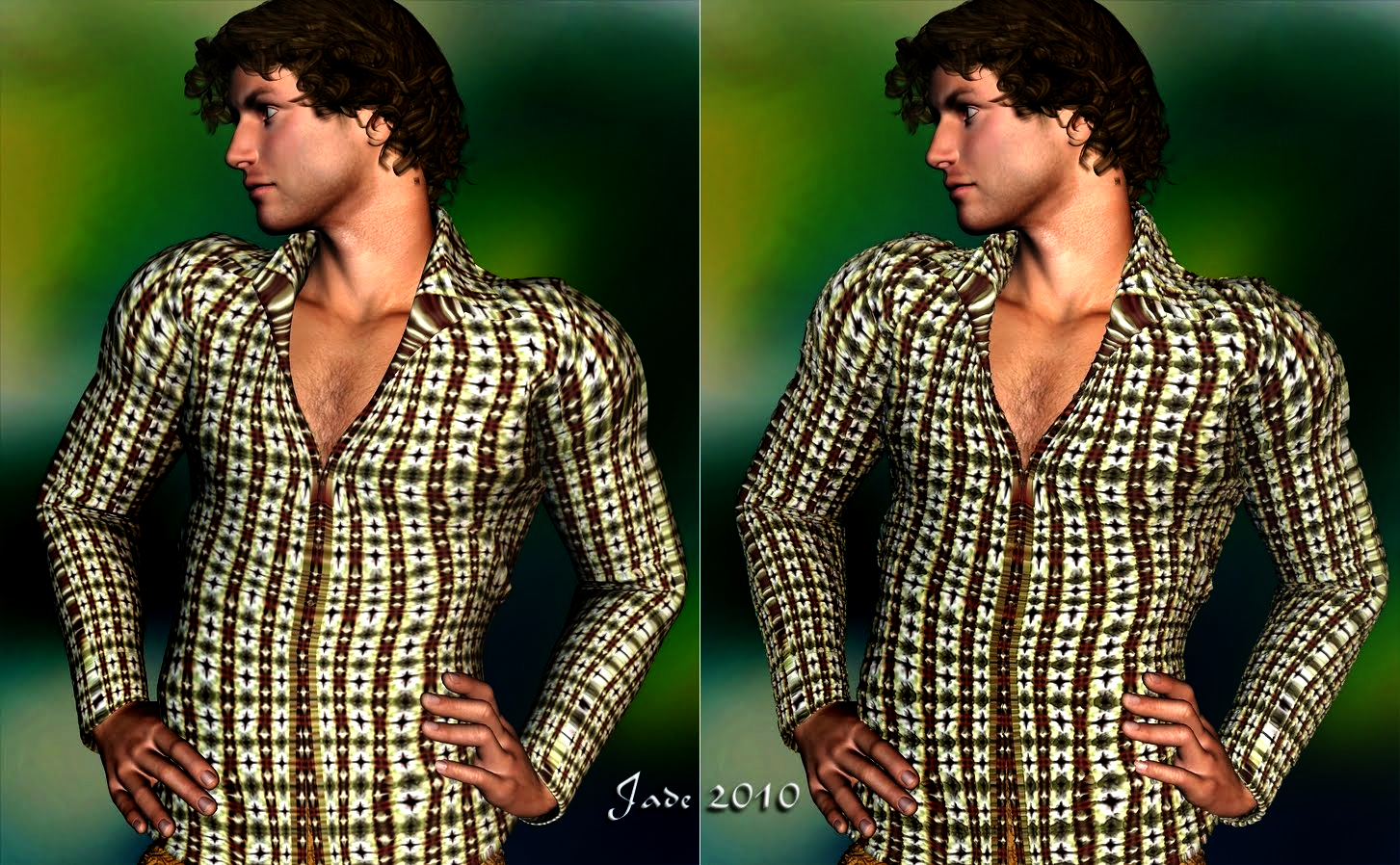 Now, the copper and silver and gold are (obviously) visible JPEGs that you apply in DAZ, just the same as the textures in the skirt and top, way above. But if you just put the JPEG on the 3D model of the bikini top, it looks like a fabric (or even plastic) screen-printed with the pattern. Hmm. You wanted some way to make it look like the very material of the model was made of iron links.