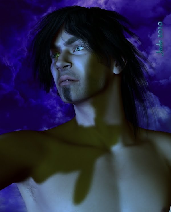 I really like these characters and this scenario. You know, I'm almost tempted to write it ... except that I'm not much of a writer. But then again, if I did it as a graphic novel... Hmmm. Let me think about this a little! In case you're wondering, the backdrop is not Bryce; it's a work done entirely in gimp brushes. There's a terrific set, from Renderosity, Mystikal's Clouds. Best set of clouds I've ever seen.Jade, 15 June 2010