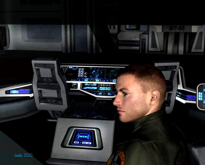 These images here have no post work done on them ... none at all. This is just the models as they load up, with lights set by me. Michael 4 has been added in -- he's wearing the flightsuit from the M4 Air Crew set. The Vanguard spacecraft is sitting in the Starcarrier hangar. Michael 4 is in the cockpit, in the ship, in the hangar.