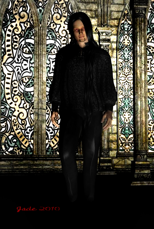 In honor of Halloween, just past, we've cast him in the part of a Goth. That's the Elven Prince hair set to ebony, and the Lockwood costume. The skinmap is Albane ... an albino. Eventually, as our hero looked less and less like a Goth, I changed out the eyes for rich green ones, but at the outset he's an albino goth, red eyes and all:
