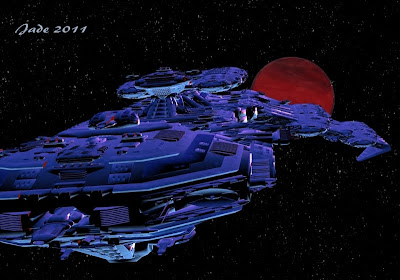 The model ship is called the Allied Fleets Frigate ... and at last! A starship model that I can open and manipulate in DAZ! Usually they're way too big. 3D models are made up of polygons, and when you exceed the number of polygons your computer can handle ... well, that's it, really. The system doesn't barf -- the model just won't load. I could open them in Bryce, but a Bryce render takes sooooooo long, you can really only get one in a day, and I like to do loads of shots. I guess I'm (still?) more of a comics artist than a fine artist. And who said there's anything wrong with comic art?!