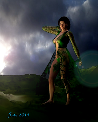 The model is Victoria 4, wearing the Yaana skin map and the Rock Star hair. The costume is the Night Lily coat -- there's supposed to be a dress under it, but, well, let's just replace it with a bikini, and set the textures of everything to something emerald green. The sky is an enlargement of a small piece of sky from a digital shot of a weather front arriving a couple of years ago, and the ground is a bit of terrain made in Bryce and exported as an .OBJ, and imported into DAZ here to serve as the ground. Nice.