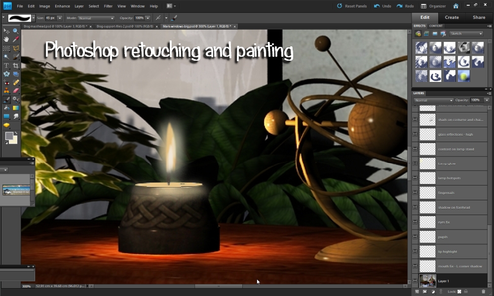 So, how many layers can be used to retouch an image? It's only limited by your computer's ability to handle the size of the project file ... but when you're done with a section of the work (for instance, the candle, or the lamp), you can also "merge layers," taking a whole bunch of layers and turning them into one. This can help to control the number of layers you're handling.